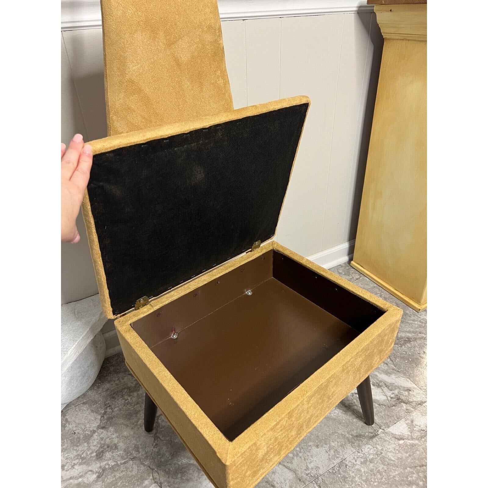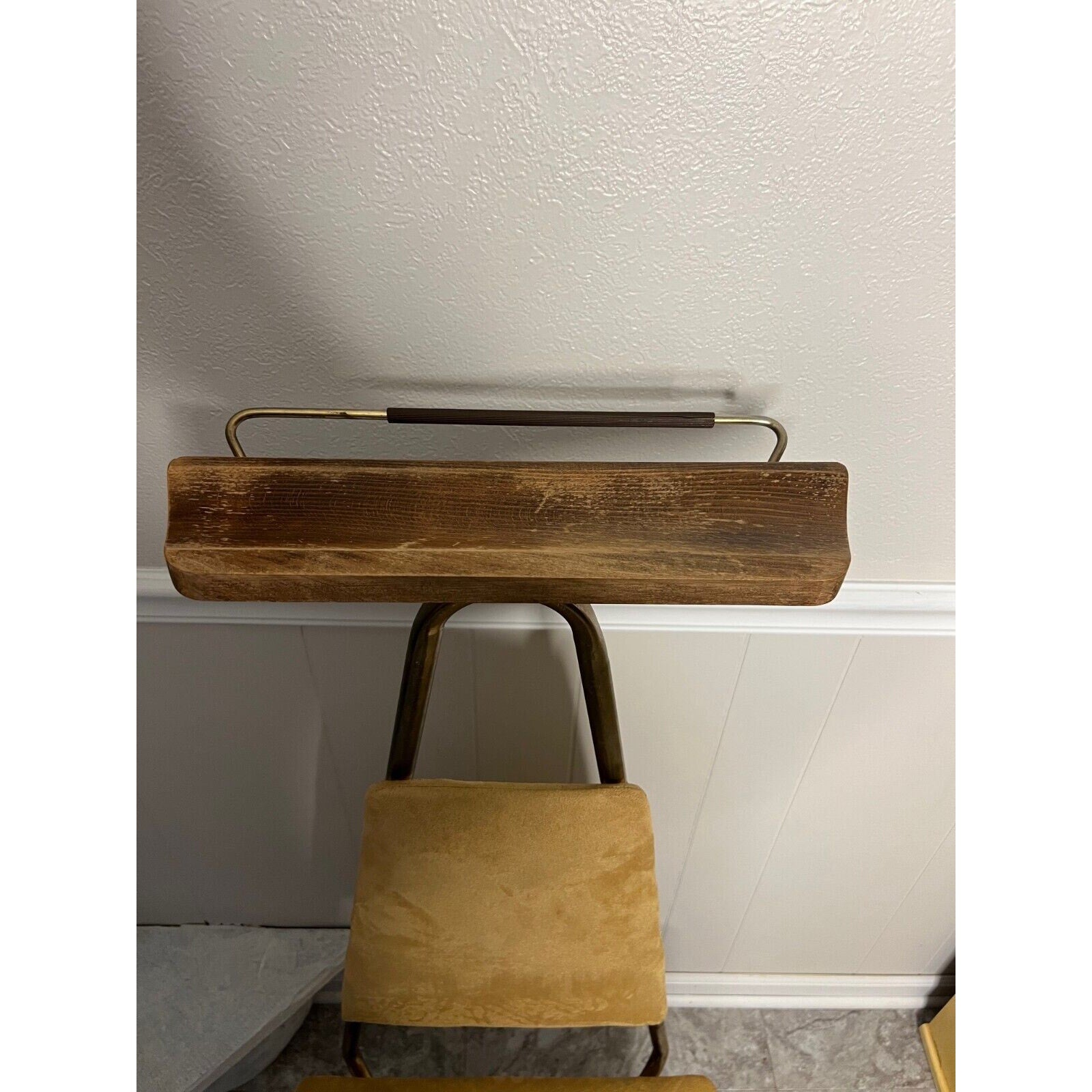 Introducing a stunning vintage men's dressing chair butler mid-century modern style. This beautiful piece is crafted with gold and features a unique design that will add character to any room. The chair has a height of 45 inches and a width of 18 inches, making it the perfect size for any space. The chair is an original piece and was manufactured in America, adding to its authenticity and charm. It is ideal for those who appreciate mid-century modern style and are looking for a unique addition to their home. This chair will make a great statement piece and will impress everyone who sees it.